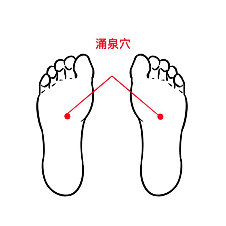 位置:涌泉穴位于当足底第2、3跖趾缝纹头端与足跟连线的前1/3与后2/3交点上,当使劲转折脚趾时,足底前部出现的凹下处即为涌泉穴。