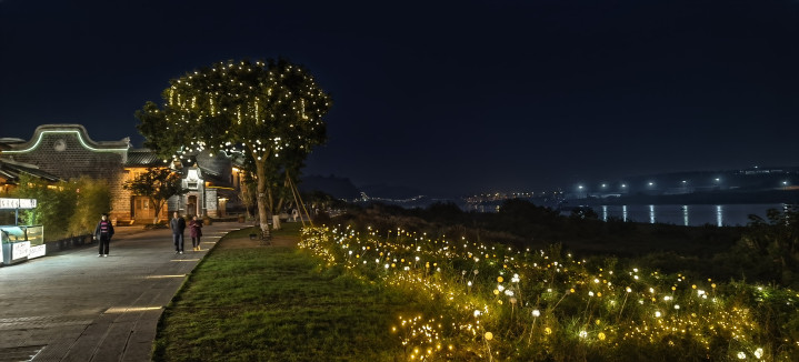 长江边上的商家点亮了萤火虫般的霓虹灯,